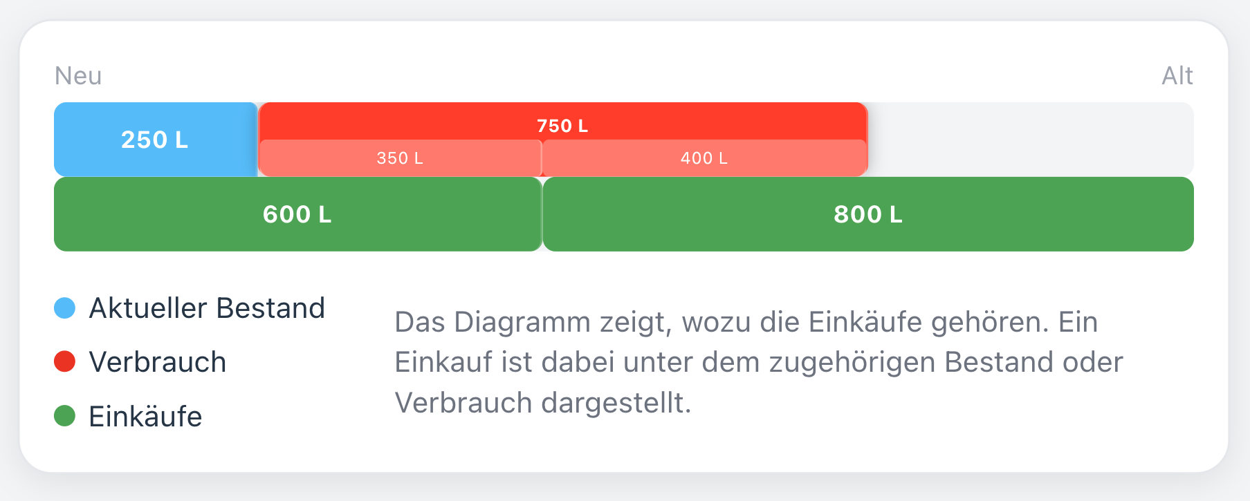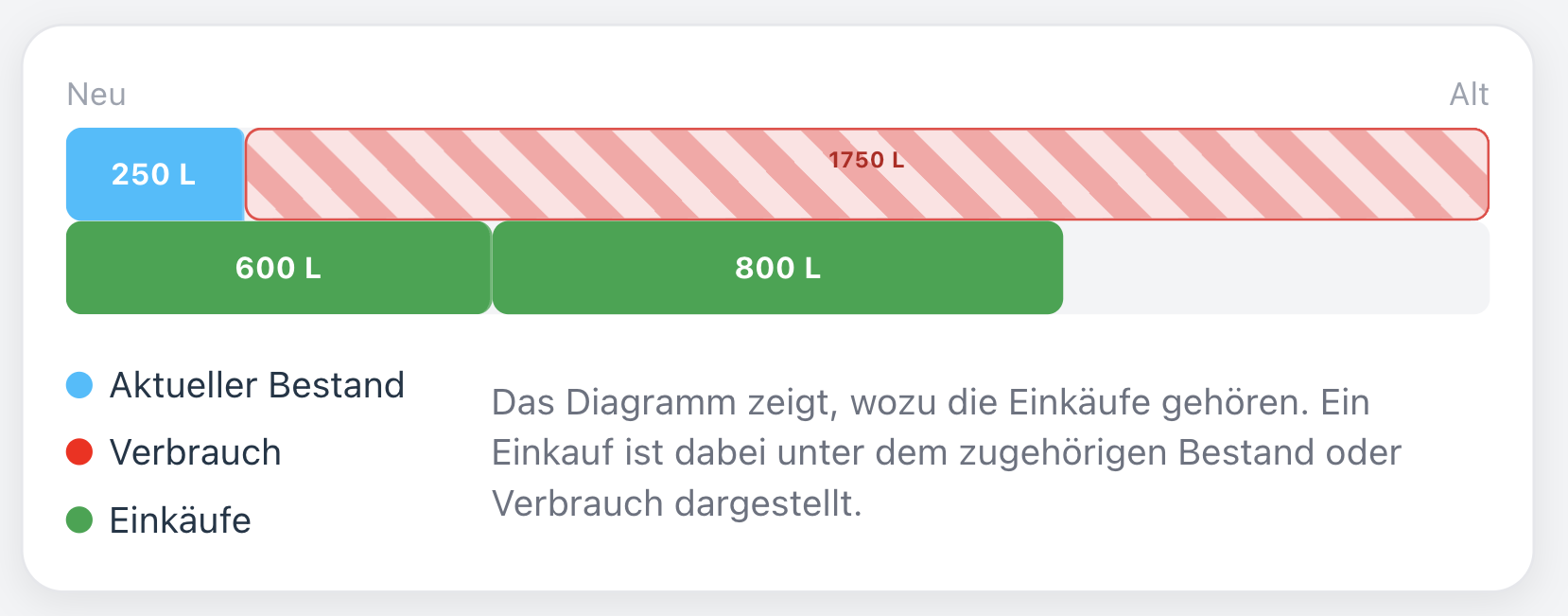 Im Beispieldiagram beträgt der Aktuelle Bestand 250L. Alle 250L des Aktuellen Bestandes gehören zu dem Ölkauf von 600L.